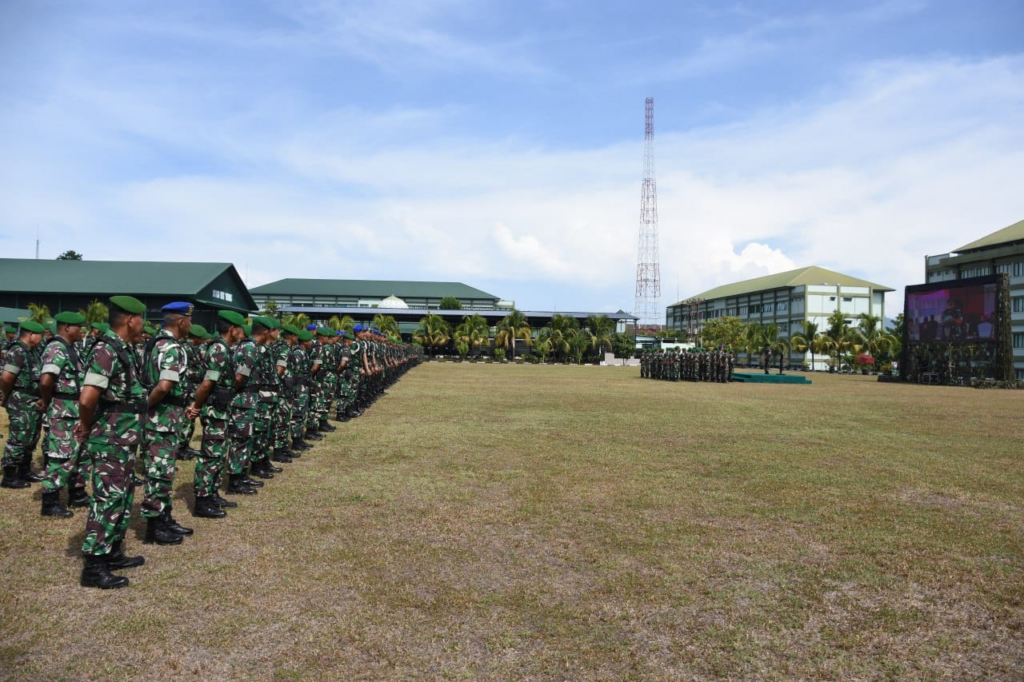 Pangdam XIII/Merdeka Mayjen TNI Legowo W.R. Jatmiko, S.I.P., M.M., bersama para Pejabat Utama (PJU) dan seluruh Prajurit Kodam XIII Merdeka se-wilayah Sulut mengikuti Apel Gelar Pasukan Dalam Rangka Kesiapan Pengamanan Pemilu 2024 secara Daring bertempat di Lapangan Makodam XIII/Merdeka, Teling Atas, Manado. Rabu (8/11/2023).