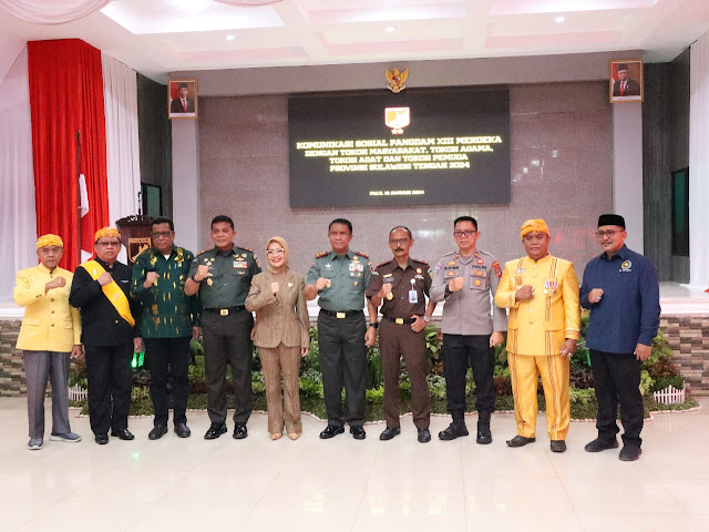 Pangdam XIII/Mdk, Mayjen TNI Legowo W.R. Jatmiko, S.IP., M.M., didampingi Danrem 132/Tdl, Brigjen TNI Dody Triwinarto, S.I.P., M.Han., gelar silahturahmi dengan Toko Agama, Tokoh Masyarakat, Tokoh Adat dan Ormas Kepemudaan Provinsi Sulawesi Tengah yang berlangsung, di Aula Manggala Sakti Makorem 132/Tdl, Palu. Kamis (18/1/2024).